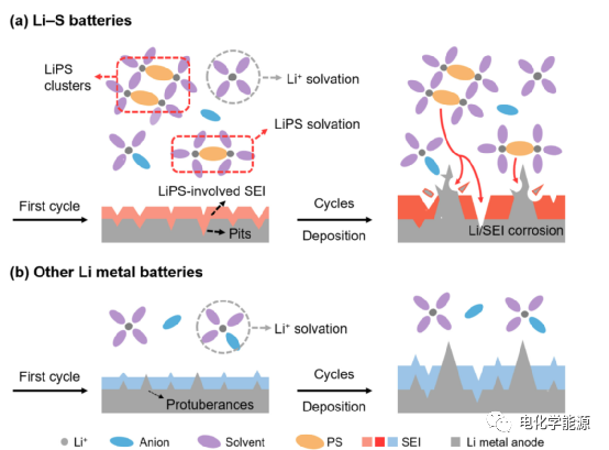 图. 锂硫电池工作锂金属负极与其他锂金属电池的比较。锂金属负极在(a)具有可溶性LiPS中间体的Li-S电池和(b)其他采用插层式正极但不含LiPS的锂金属电池中的演变。