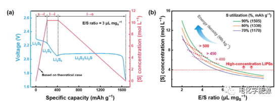 图. LiPS演化的计算。(a)锂硫电池的典型放电曲线和低E/S比下总S组分的浓度变化。(b)不同E/S比和不同硫利用率下可溶性LiPS的浓度变化。