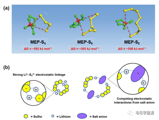 图. 稳定LiPS以降低与Li阳极的反应性。(a)MEP+与Sx2-络合反应的产物构型和吉布斯自由能。(b)Li22+-Sx2-键网络因Li+和锂盐阴离子之间的竞争静电相互作用而被破坏。