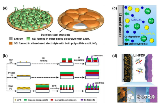 图. 锂硫电池中锂金属负极的原位SEI保护。(a)在不同电解液中沉积在衬底上的Li的形貌示意图。(b) LiPS浓度对SEI演化和Li沉积的作用。(c)以PSD为电解质添加剂,形成稳定的Li有机硫化物/有机多硫化物-Li2S/Li2S2杂化SEI层。(d)LiHFDF如何抑制LiPS的Li枝晶生长和穿梭。