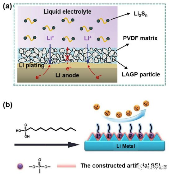 图. 锂硫电池中锂金属负极的人工SEI保护。(a)PVDF-Li1.5Al0.5Ge1.5(PO4)3复合保护层的锂沉积行为示意图。(b)锂表面重复循环时锂癸基膦酸盐层的设计和效果示意图。