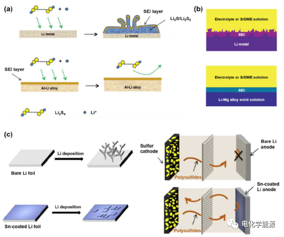 图. 通过锂合金阳极或合金界面强化块体锂。(a)Li-Al合金与Li金属在LiPS溶液中界面稳定性的图解。(b)比较了Li和Li-Mg合金在不同条件下的表面形貌演变。(c)Li在裸Li箔和镀锡Li箔上的沉积和唇部穿梭行为示意图。