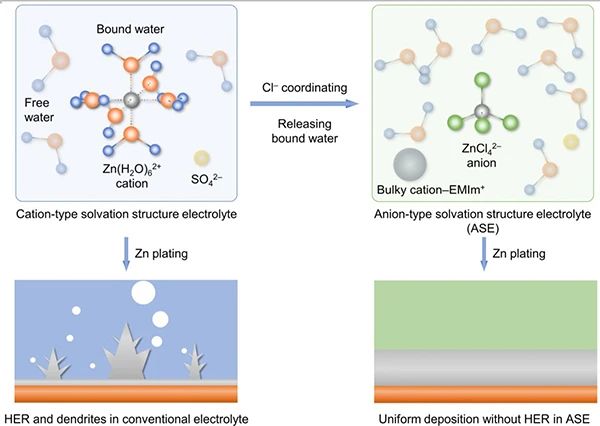 近日,南开大学陈军院士在Angewandte Chemie International Edition上发表了题为“Designing anion-type water-free Zn2+ solvation structure for robust Zn metal anode”的论文。该论文提出枝晶和析氢反应(HER)都与Zn2+溶剂化结构-Zn(H2O)62+相关,因此可以通过将Zn(H2O)62+转化为阴离子型无水溶剂化结构-ZnCl42-来解决,这可以通过在在传统ZnSO4水系电解质中添加具有大体积阳离子的氯化物盐(1-乙基-3-甲基咪唑氯化物)实现。阳离子-水相互作用的消除抑制了HER,而Zn尖端和阴离子溶剂化结构之间的静电排斥抑制了枝晶的形成。因此,电解液显示出均匀的锌沉积,平均镀锌/剥离库仑效率为~99.9%,在以预锌化聚苯胺为正极的无负极锌电池中,300次循环后容量保持率为78.8%。