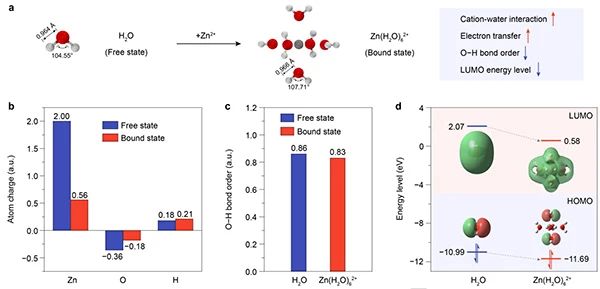 图2、a)自由态和束缚态的水分子;b)Zn2+和H2O的原子电荷;c)H2O的O-H键级;d)自由水和Zn(H2O)62+的LUMO。