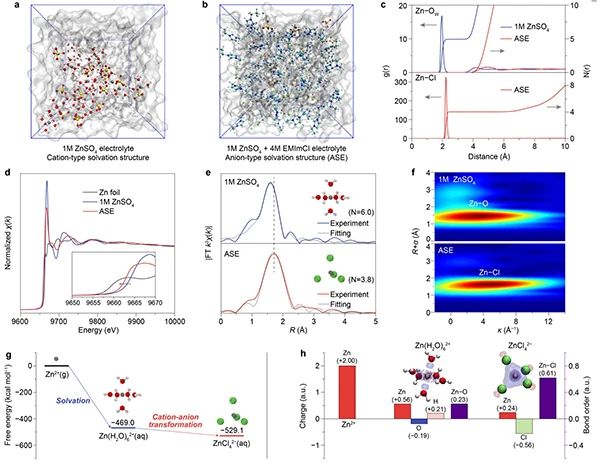 图3、a)1M ZnSO4电解质的MD快照;b)ASE的MD快照;c)Zn2+和OW/Cl?之间的RDF和配位数;d)锌箔、ZnSO4电解质和ASE的归一化XANES光谱;e)在R空间中EXAFS光谱的拟合;f)EXAFS光谱的小波变换图像;g)Zn2+溶剂化和阳离子-阴离子转化过程中的自由能变化;h)Zn(H2O)62+和ZnCl42-的原子电荷、键级和微分电荷密度分析。