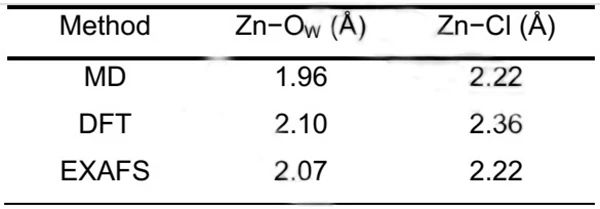表 1、通过MD模拟、EXAFS拟合和DFT计算得到ZnSO4电解质和ASE中Zn-OW和Zn-Cl键的键长。