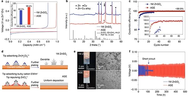 图4a显示,使用ASE的Zn||Cu纽扣电池在1 mA cm?2下,具有比ZnSO4(80.5%)高得多的首圈库伦效率(98.4%)。库伦效率损失主要是由HER引起的,它会产生相应的OH?并使Zn2+沉淀。通过XRD检测到ZnSO4电解液中Zn沉积副产物为ZnSO4·3Zn(OH)2·4H2O,而ASE中的Zn沉积没有副产物。由于ASE中锌电镀/剥离的高可逆性,实现了~99.9%的高库伦效率。