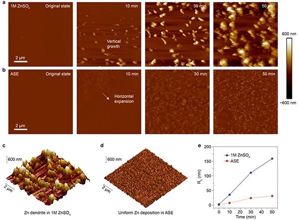 图5、a)电流密度为40 μA cm-2时,ZnSO4电解质中不均匀点分布的Zn核和垂直枝晶生长;b)在相同电流密度下,面分布的Zn核和ASE中Zn的均匀沉积;c)50分钟时ZnSO4电解液中Zn沉积的AFM高度图像;d)50分钟时ASE中锌沉积的AFM高度图像;e)镀锌过程中电极表面形态的粗糙度演变。