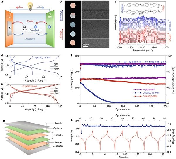 图6、a)无负极Cu|ASE|Z-PANI电池的结构和氧化还原机制;b)Cu|ASE|Z-PANI电池中Cu集流体上Zn沉积的光学照片和相应的SEM形貌;c)Cu|ASE|Z-PANI电池中Z-PANI正极的原位拉曼光谱;d)Cu|ZnSO4|Z-PANI电池和e)Cu|ASE|Z-PANI电池在1 A g-1下的充放电曲线;f)无负极电池和Zn|ASE|PANI电池的循环性能;g)组装的多层软包电池示意图;h)Ah级Zn|ASE|PANI软包电池在2 A电流下的充放电曲线和循环性能。