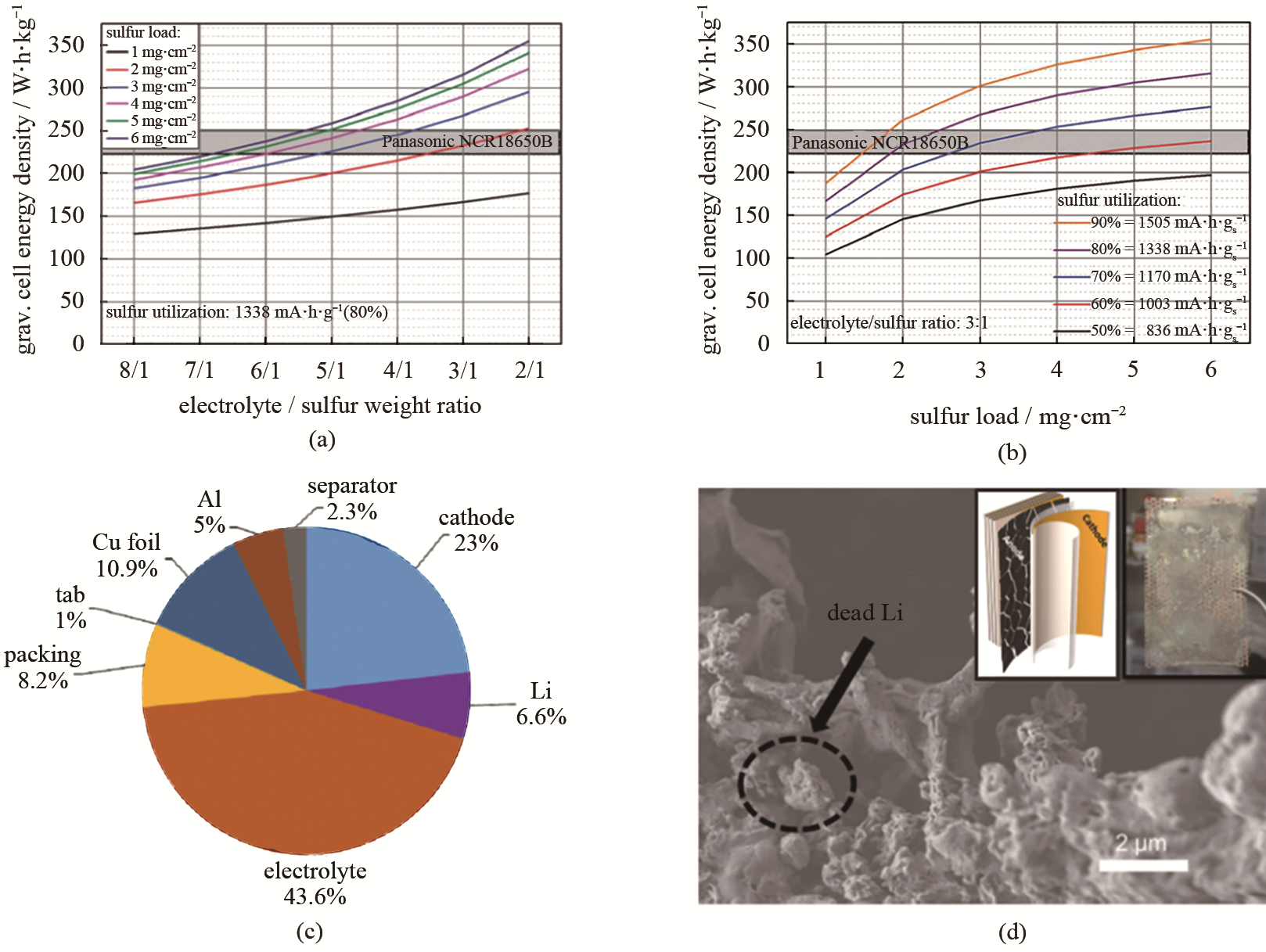 | 图4 18650型锂硫电池在(a)不同载硫量、不同E/S比例条件下能量密度的变化(固定硫利用率80%);(b)不同载硫量、不同硫利用率下能量密度的变化(固定E/S=3);(c)2.5 A·h、300 W·h/kg软包锂硫电池中不同电池组分的质量分布,其中电解液的质量分数约为43.6%;(d)软包锂硫电池循环后金属锂负极的SEM。图片许可复制来自Wiley 2015,ACS 2018,Elsevier 2017 |