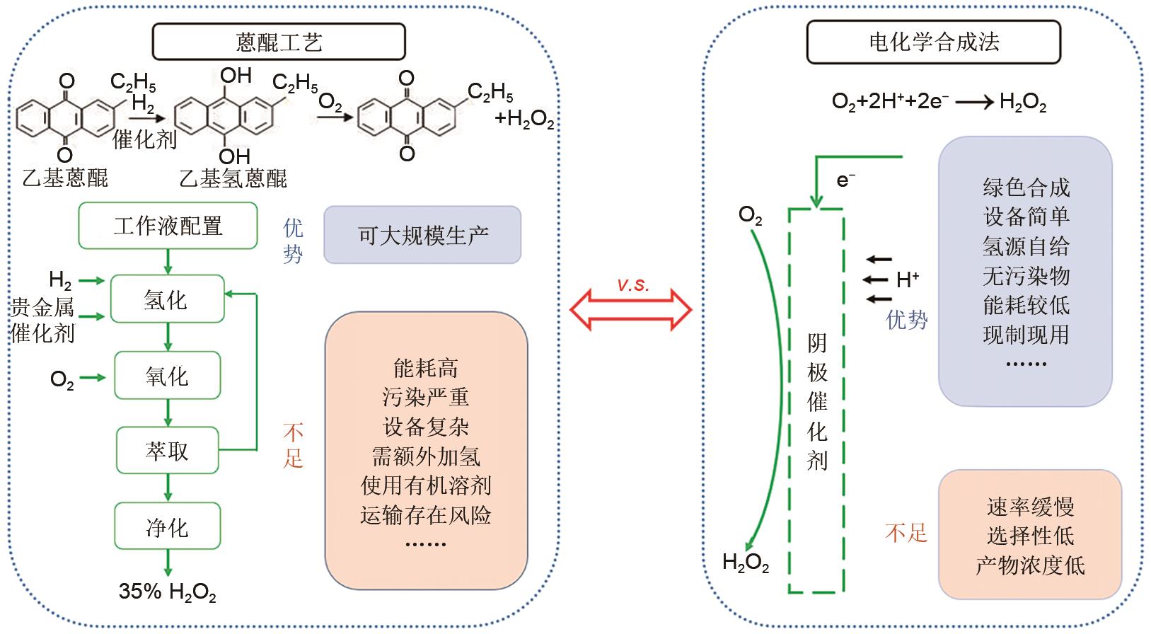 | 图 1 蒽醌法与电化学合成法的流程与工艺特点 |