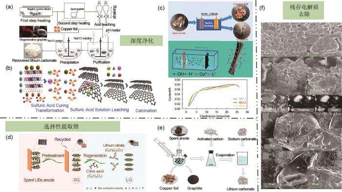 (a) Flow chart of inorganic acid recovery process; (b) Low temperature sulfuric acid solidification method; (c) Waste graphite anode before electrolysis, recovered copper foil and anode active material after electrolysis, separation of graphite and copper foil and dissolution of Li+ process and the change of current with electrolysis time; (d) Schematic diagram of organic acid leaching; (e) Water-soluble lithium salt recovery process; (f)SEM images of untreated, heat-treated, heat-treated graphite after subcritical CO2-assisted electrolyte extraction, and heat-treated graphite after supercritical CO2-assisted electrolyte extraction[16,23-24,26,31,37]