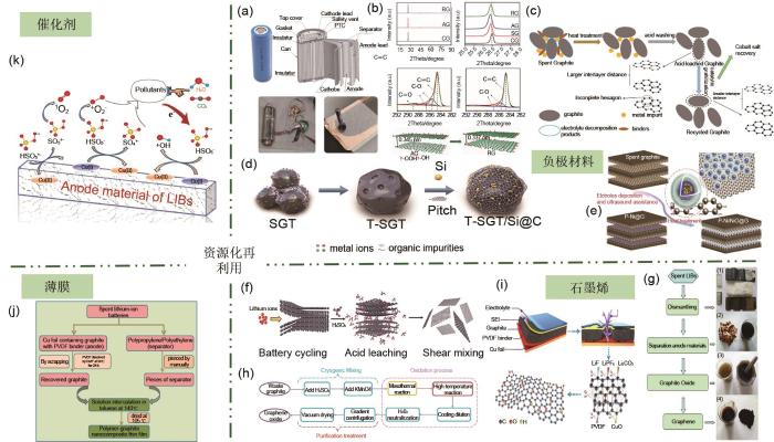 (a) Schematic diagram of 18650 cell and interior, 18650 cell after removal of upper and lower covers and opening of can, and completion of RAM anode laminate; (b) XRD patterns of CG, AG and RG, (002) peak reflection, XPS high resolution spectra and structural models of AG and RG with different interlayer spacings; (c) Schematic illustration for the regenerating process of graphite from spent LIBs; (d) Schematic diagram of the synthesis process of T-SGT/Si@C anode material; (e) Synthesis process of P-Ni/NiO@G electrode; (f) Schematic diagram of battery cycling and lattice expansion of acid-leached graphite; (g) Preparation method of graphene from waste Li-ion batteries; (h) Schematic diagram of experimental steps for preparing graphene oxide by improved hummers method; (i) Preparation using waste graphite model of graphene oxide; (j) Preparation process of polymer-graphite nanocomposite films; (k) PMS activation in AM/PMS system and reaction mechanism of RhB degradation[38, 42-43, 46-49, 51, 53-54]