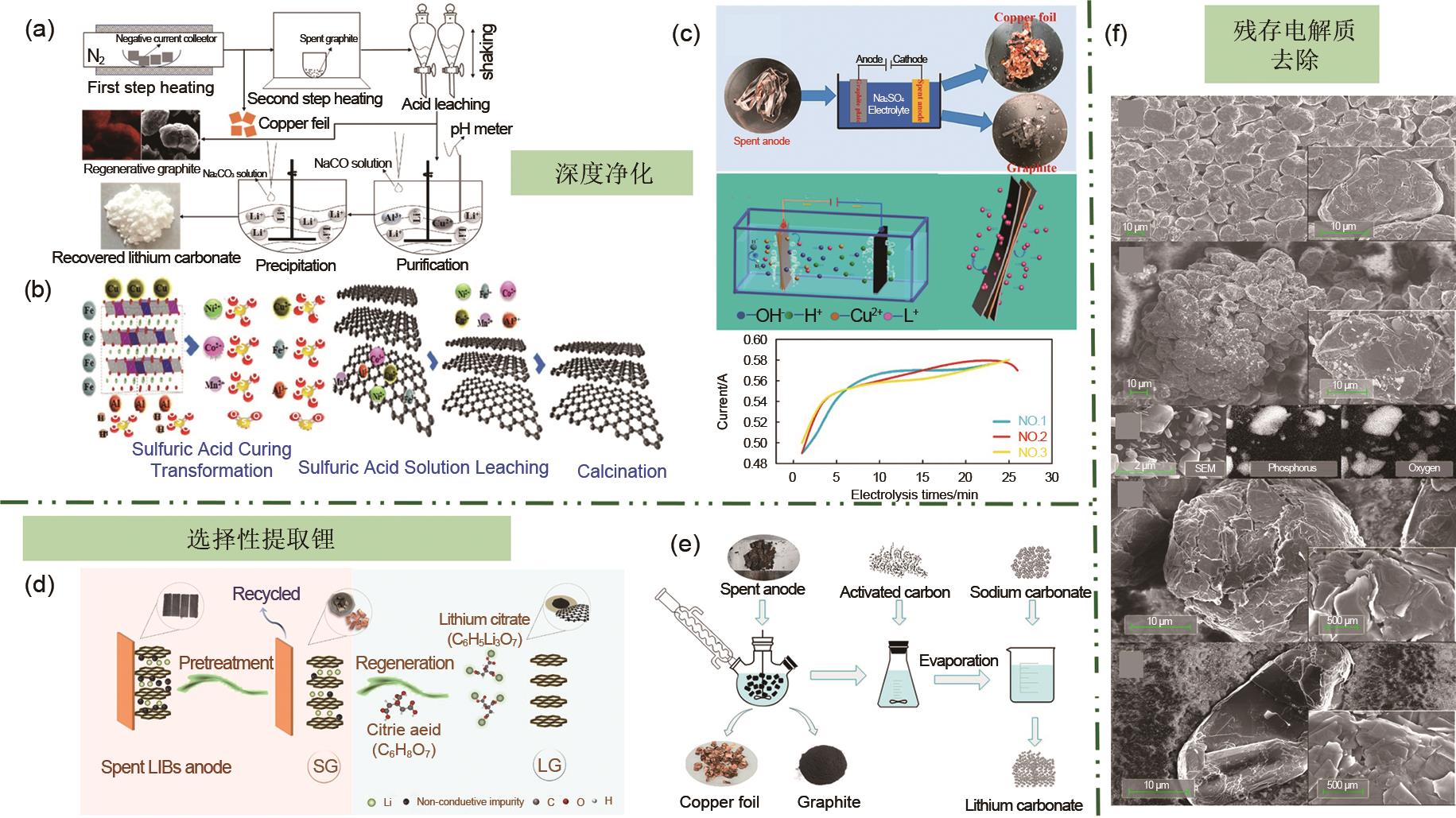 | Fig. 2 (a) Flow chart of inorganic acid recovery process; (b) Low temperature sulfuric acid solidification method; (c) Waste graphite anode before electrolysis, recovered copper foil and anode active material after electrolysis, separation of graphite and copper foil and dissolution of Li+ process and the change of current with electrolysis time; (d) Schematic diagram of organic acid leaching; (e) Water-soluble lithium salt recovery process; (f)SEM images of untreated, heat-treated, heat-treated graphite after subcritical CO2-assisted electrolyte extraction, and heat-treated graphite after supercritical CO2-assisted electrolyte extraction[ |