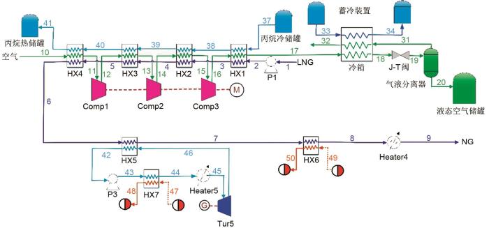 在用电低谷期,系统运行储能模式,如图1所示。首先,泵P1将常压LNG加压至7.51 MPa。电网富余的电能驱动三级空气压缩机,空气经带有级间冷却的三级压缩过程升压,同时LNG和液态丙烷依次经过4个换热器回收压缩热,使压缩空气液化,此时的空气经过一系列压缩冷却后,送入冷箱进一步冷却,达到一定参数后,经J-T阀节流液化,最后常压空气经过气液分离器分离,液态空气储存在液态空气储罐中;从换热器HX4排出的低温天然气进入换热器HX5与有机朗肯循环工质(ORC)进行换热,再次升温的低温天然气进入换热器HX6液化数据中心冷却剂。最后,低温天然气进入海水加热器升温至288 K,流出系统。