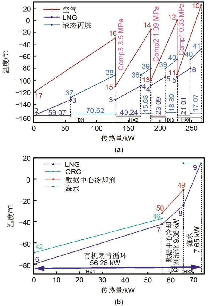 在LNG气化的低温范围(111~192 K),释放的冷量为143.41 kW,占总冷量的66.18%,该部分冷量被LAES吸收。如图3(a)所示,液化空气的冷源来自于LNG和液态丙烷的冷能两部分,液态丙烷冷能在相对较高的温度下使用(编号37~41),LNG冷能在相对较低的温度下使用(编号2~6),空气主要通过与LNG进行换热而液化。如图3(b)所示,在LNG气化的中温范围(192~230 K),ORC吸收LNG的冷量为56.28 kW,占总冷量的25.97%,由图可知,ORC工质的冷凝降温曲线(编号42~46)与LNG的气化升温曲线(编号6、7)之间的距离明显小于空气与LNG换热曲线之间的距离,故此次换热能够高效地利用LNG冷能。最后,在LNG气化的高温范围(230~248 K),数据中心冷却剂的液化过程吸收LNG的冷量为9.36 kW,占总冷量的4.32%。系统对LNG的冷能梯级利用,能够减少能量浪费,增加能量利用率。