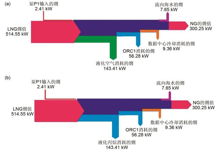 LNG气化过程的㶲流程图,如图4所示。在储能模式下,泵P1将2.41 kW的有效能传递给常压LNG使其增压至7.51 MPa,高压的LNG将143.41 kW冷能用于空气液化、56.28 kW冷能用于ORC、9.36 kW冷能通过换热器HX6用来液化数据中心冷却剂,最后低温天然气通过海水加热器升温至288 K排出系统。在释能模式下,LNG也在不断气化释放冷能,在储能模式下用来液化空气的LNG高品位的冷能,此时被丙烷回收,其余LNG冷能利用过程与储能模式相同。