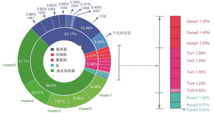 系统中泵、压缩机和膨胀机的㶲损失大小及㶲效率如表5所示,各设备㶲损失占比如图6所示。系统总㶲损失为667.01 kW,海水加热器㶲损失最多,占总㶲损的56.20%。这因为在海水加热器中,海水带走了低温工质释放的冷能,造成了大量的有效能损失,可以通过优化操作条件或使用额外的冷能回收工艺,回收更多的冷量。由于冷热流(LNG和空气、LNG与ORC工质、LNG与数据中心冷却剂)之间的传热温差,换热器(4个多股物流换热器、冷箱和气化换热器)的㶲损占比为214.57 kW,占总㶲损的32.17%。三台空气压缩机输入的有效能为164.78 kW,但由于LNG对热空气进行了级间冷却,使空气压缩机能耗和㶲损失降低,故三台空气压缩机的㶲损失也仅为26.89 kW,占比为4.03%,每台压缩机的㶲效率都在80%以上。