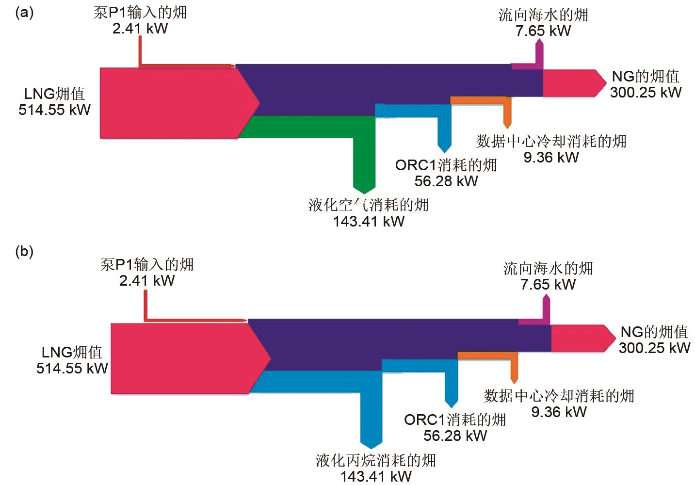 | Fig. 4 Exergy flow diagram of LNG regasification: (a) energy storage process and (b) energy release process |