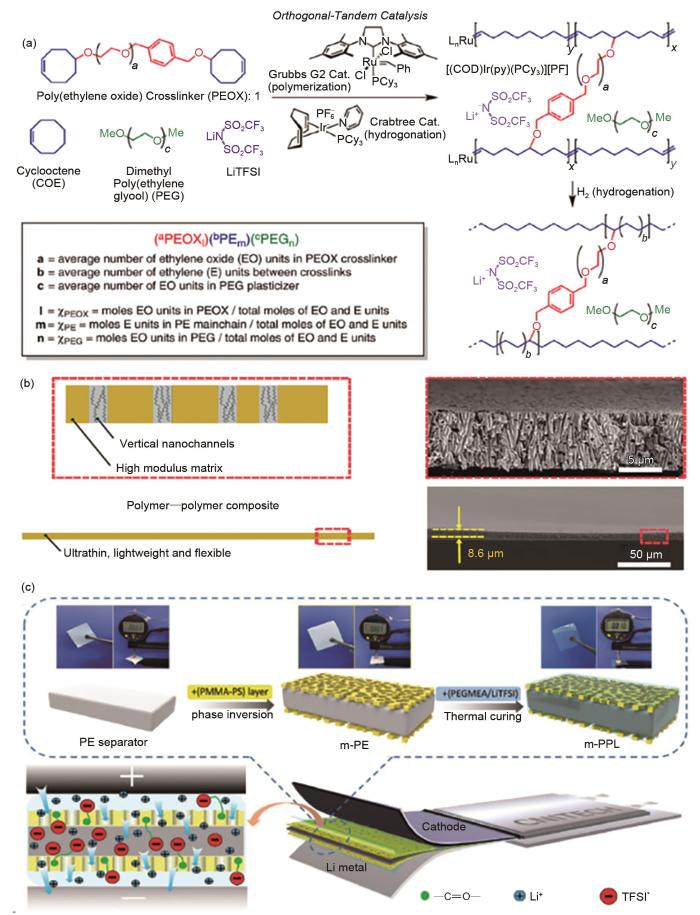 图6 (a) 聚乙烯/ 聚环氧乙烷固体聚合物电解质的合成与命名[82 ] ;(b) 聚合物复合材料SSE 的设计原理示意图( 左) ,超薄纳米孔PI 薄膜的横断面扫描电镜图像和排列整齐的纳米孔的放大图像( 右) [83 ] ;(c) m-PPL 的制备工艺示意图[85 ] (a) Polyethylene/poly(ethylene oxide) solid polymer electrolyte synthesis and nomenclature [82 ] ; (b) Schematic diagram showing the design principles of polymer-polymer composite SSE (left) and Crosssectional SEM images of an ultrathin nanoporous PI film with zoomed-in image of the aligned nanopores (top) (right) [83 ] ; (c) Schematic diagram of preparation process for the m-PPL [85 ] Fig. 6 ![]()