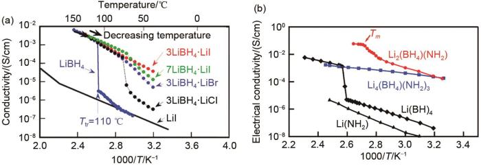 ; (b) The relationship between conductivity and temperature of Li2 (BH4 )(NH2 ) and Li4 (BH4 )(NH2 )3 [97 ] Fig.7 ![]()