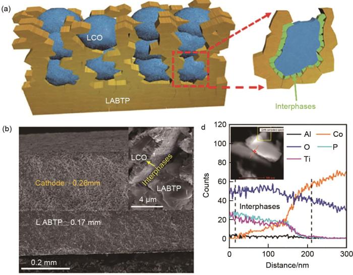(a) Schematic diagram of the co-sintered composite cathode and SSE with in-situ formed interphases; (b) SEM imagine of LABTP/LCO-LABTP interphases and X-ray spectroscopy (EDS) line scan across the interphases[149 ] Fig. 11 ![]()