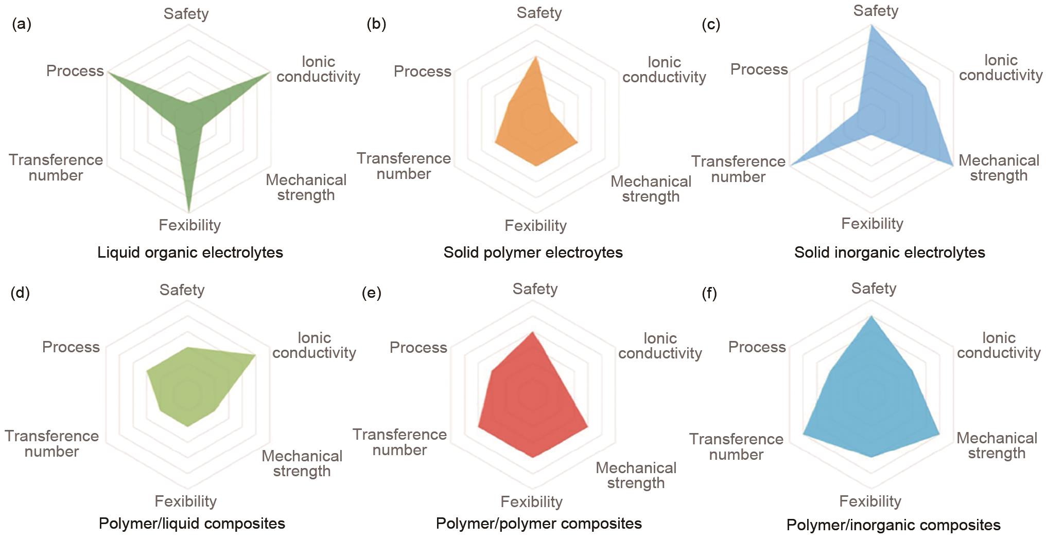 | Fig. 5 Radar plots of the performance properties of different electrolytes: (a) liquid organic electrolytes; (b) solid polymer electrolytes; (c) solid inorganic electrolytes; (d) polymer/liquid composites; (e) polymer/polymer composites and (f) polymer/inorganic composite[ |