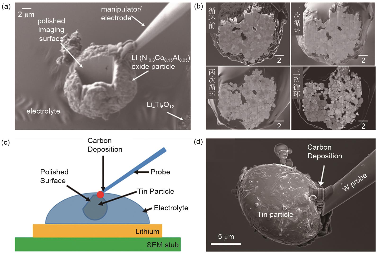 Fig. 12 (a) A microreactor with a integrated single-particle microelectrode operating in a FIB/SEM chamber[101]; (b) Evolution of the microstructure of an NCA single particle during cycling[101]; (c) Schematic of a microreactor used for in-situ observation of particle microstructure evolution and volume changes[102]; (d) SEM image of a tin single-particle microelectrode[102]