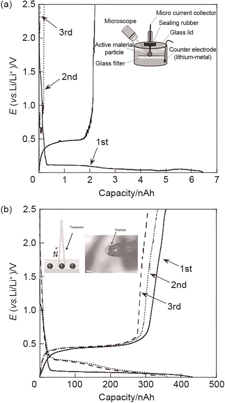 | Fig. 15 Charging and discharging curves of (a) a Si particle obtained using a contact-based single-particle microelectrode and (b) a tweezers-type of micro current collector[ |