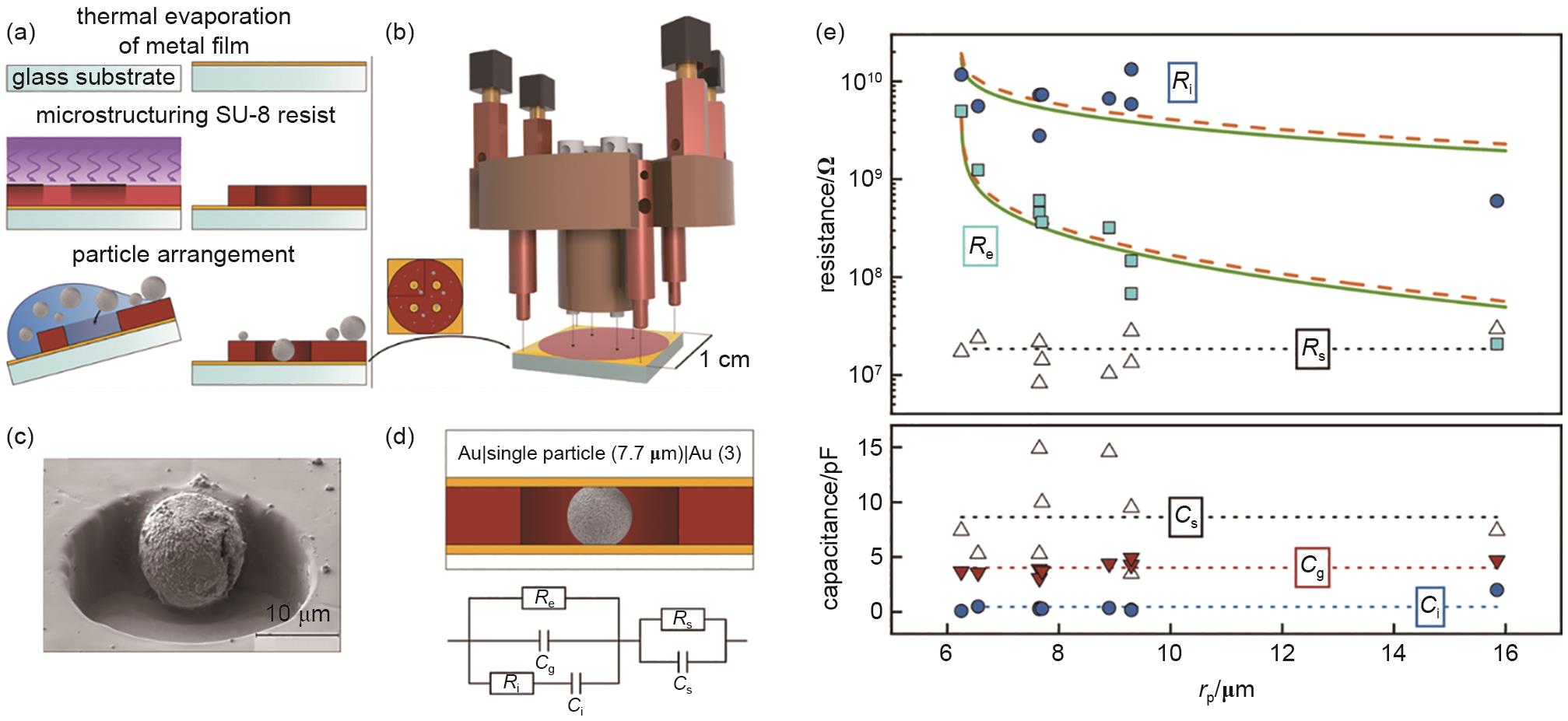 图16 (a) 凹坑式单颗粒微电极的制备过程[116];(b) 特制电池示意图[116];(c) 凹坑式单颗粒微电极的SEM图[116];(d) 离子堵塞电极体系示意图及其等效电路模型[116];(e) 基于等效电路模型拟合得到的电阻值和电容值与颗粒粒径的关系[116]