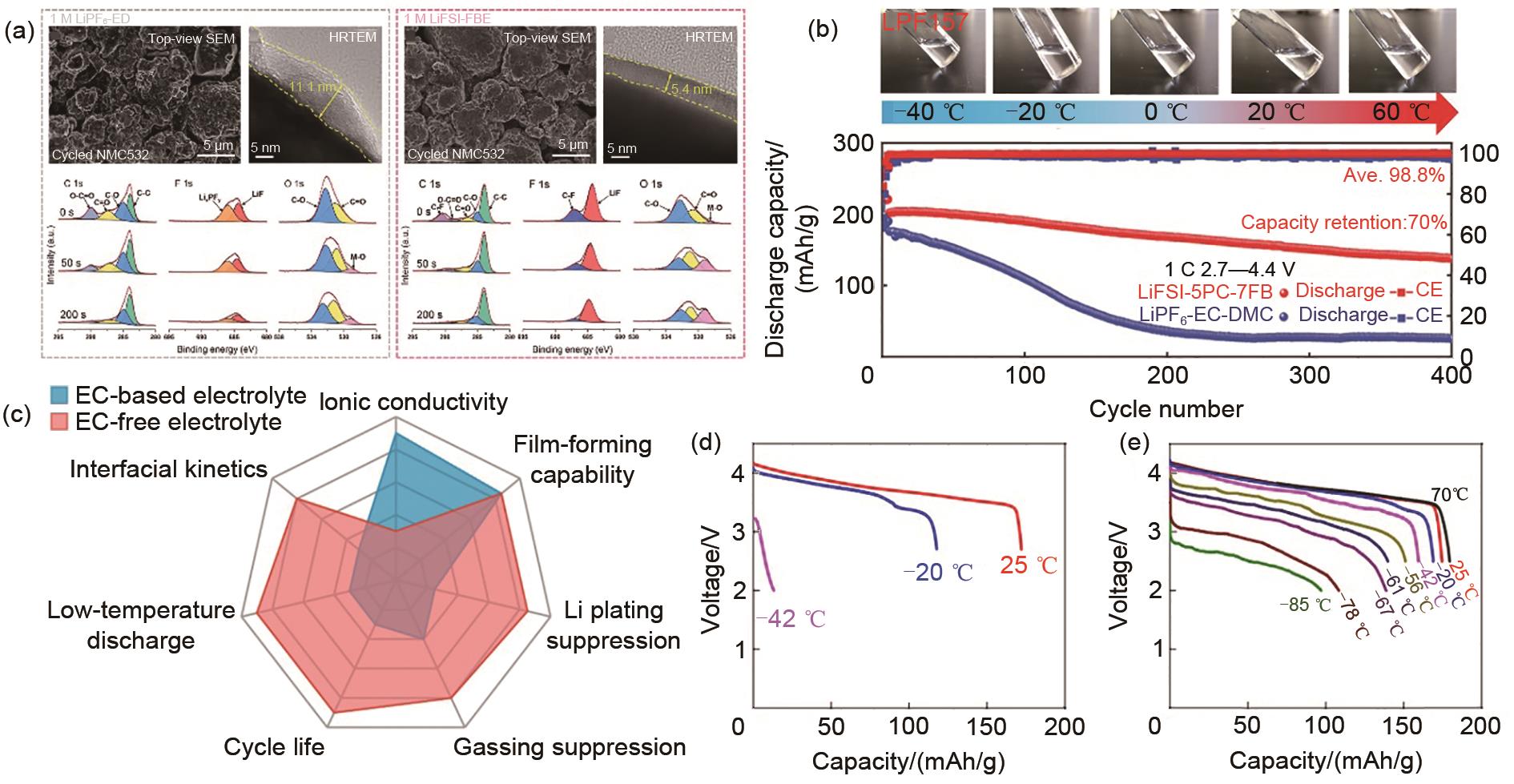 | Fig. 12 Summary of low-temperature electrolyte performance (a) Comparison of the characterization of two electrolytes in the NMC532 system after 20 cycles[ |