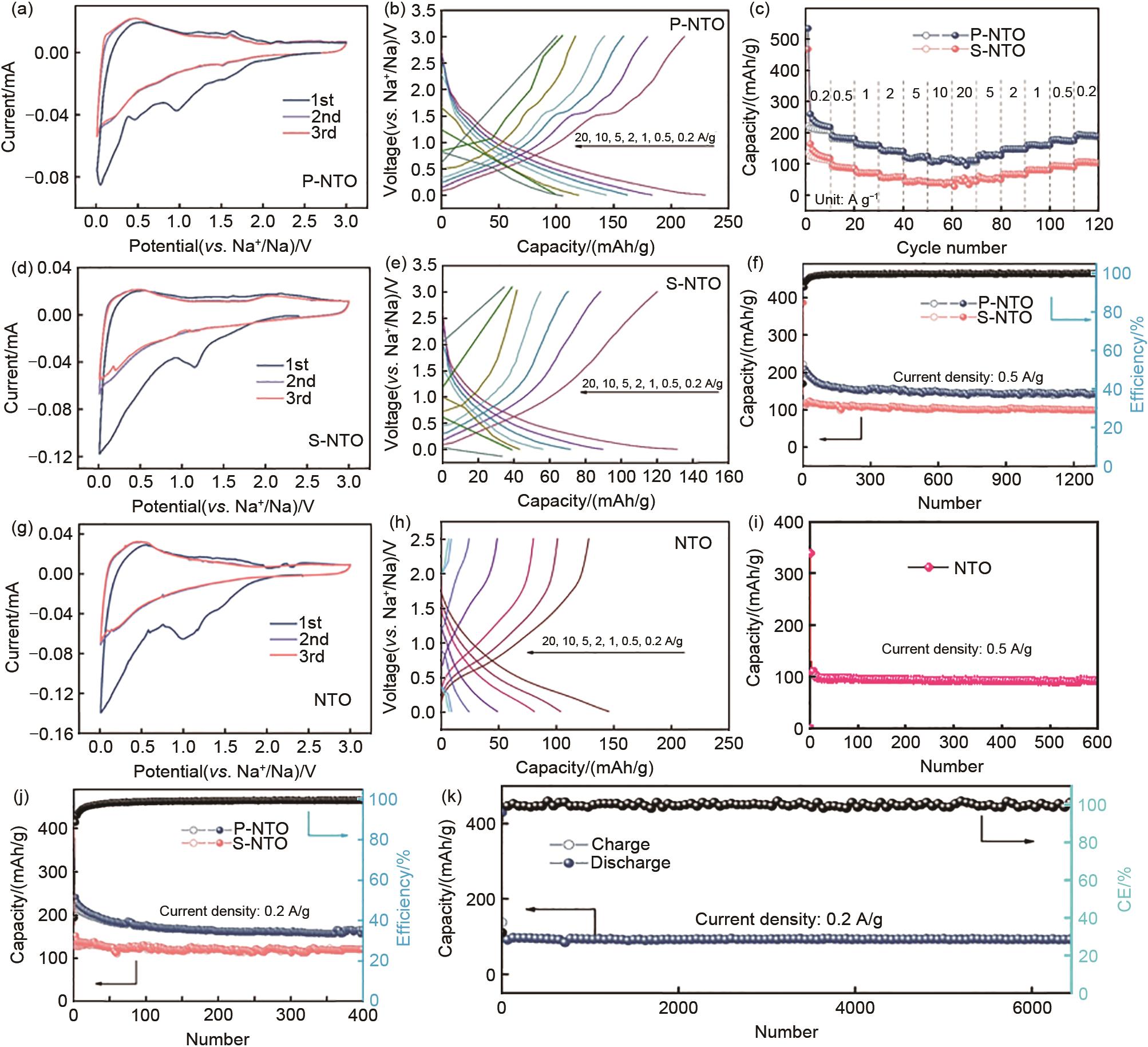 | Fig. 3 Electrochemical performance of P-NTO and S-NTO electrode. CV curves for the first 3 cycles of P-NTO (a), S-NTO (d) and NTO (g) measured at a sweep rate of 0.1 mV/s. Charge-discharge curves of P-NTO (b), S-NTO (e) and NTO at different rates (h). (c) Rate performance of P-NTO and S-NTO. (f), (j) Cycling performances of P-NTO and S-NTO at a current density of 0.5 A/g and 0.2 A/g. (i) Cycling performances of NTO at a current density of 0.5 A/g. (k) 6500 continuous cycles at a rate of 2 A/g |